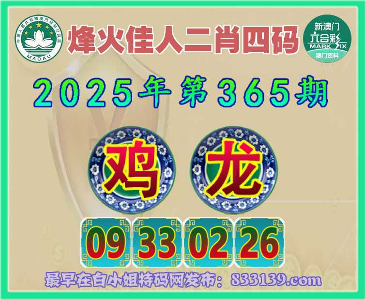 365期:【烽火佳人】 二肖四码【鸡】【09.33.02.26】开:龙26准上榜高手